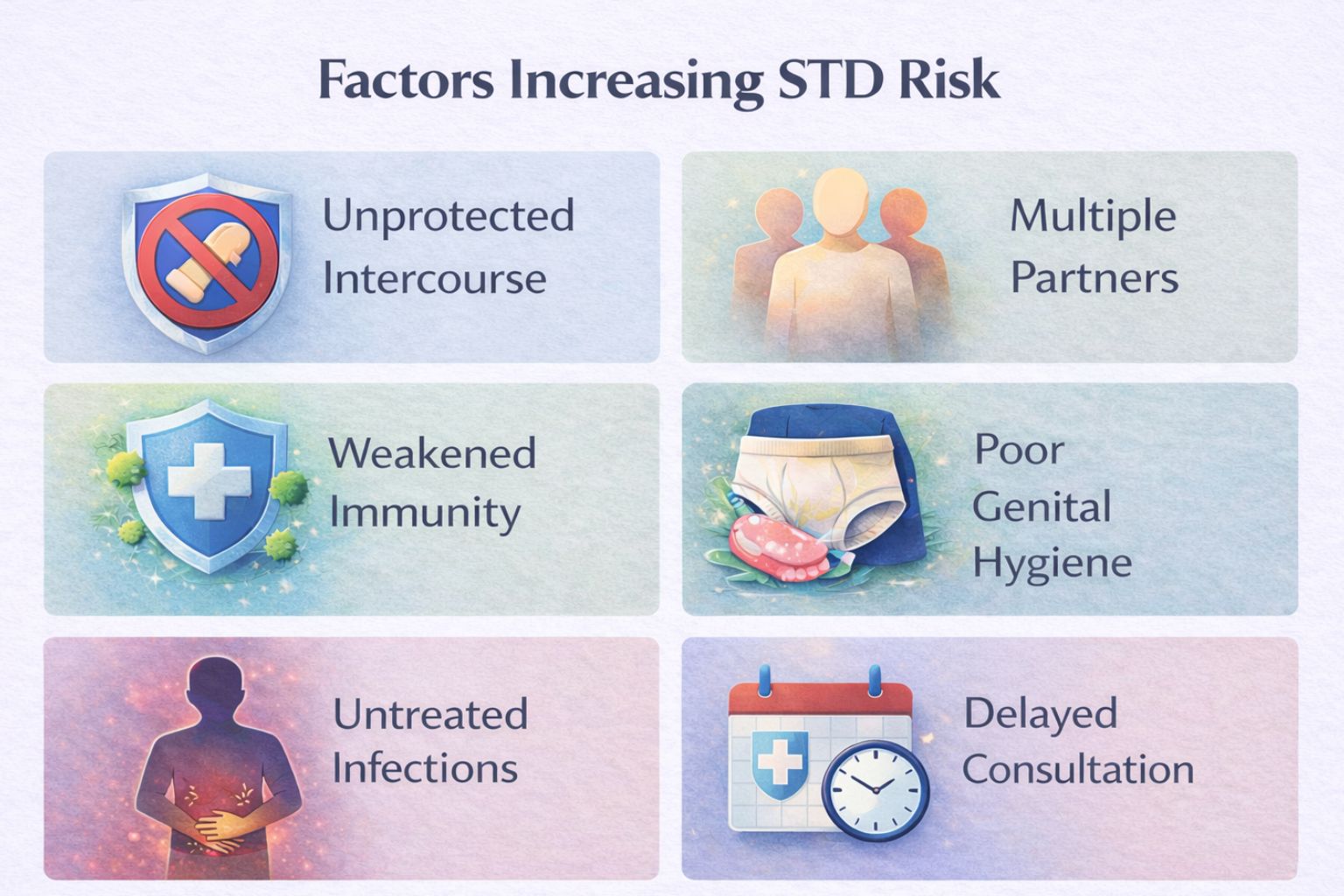 The risk of developing sexually transmitted infections may increase due to multiple factors, including unprotected intercourse, multiple partners, weakened immunity, poor genital hygiene, or untreated infections in a partner.